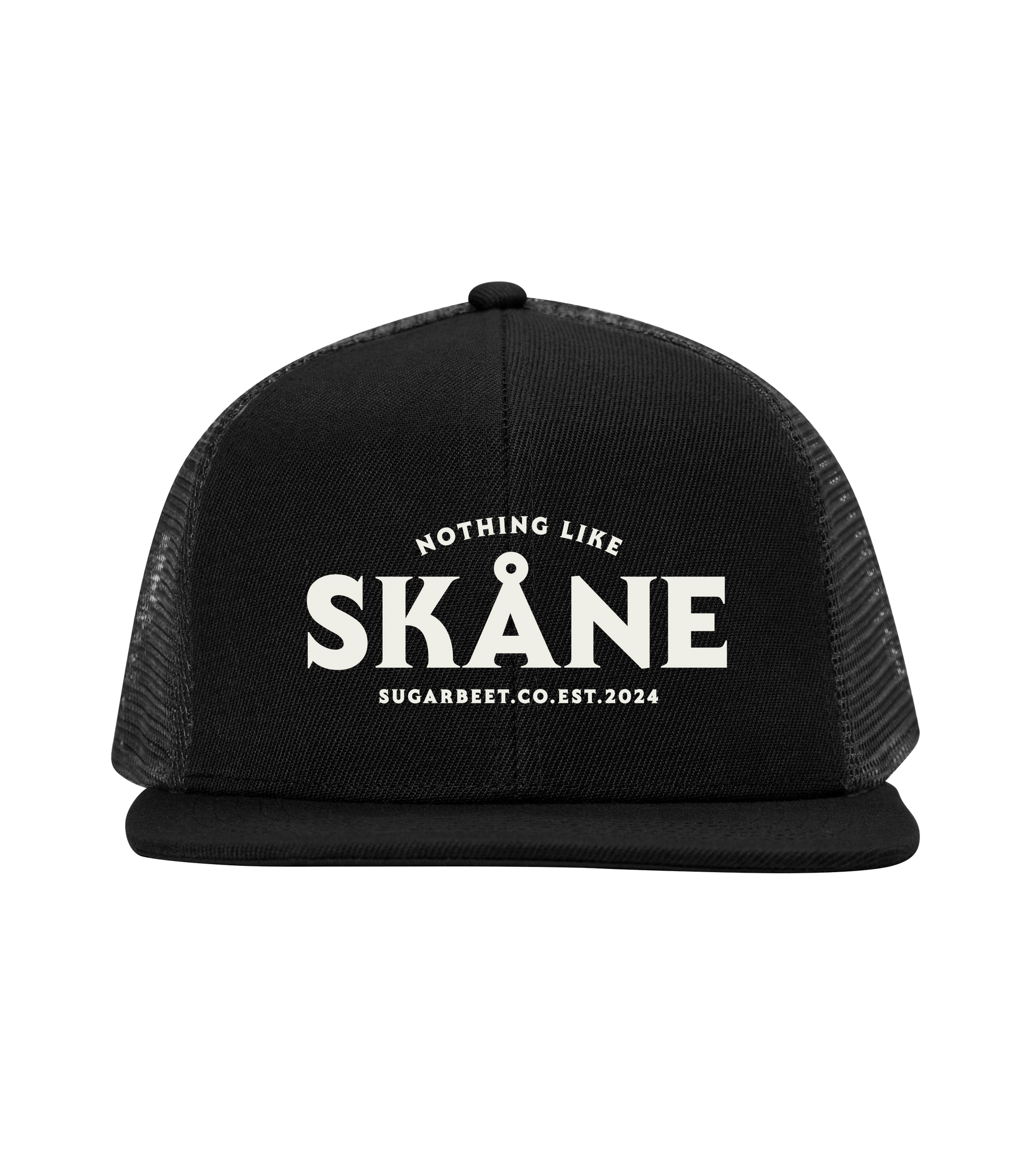 En 6-panels truckerkeps tillverkad i polyester och polyestertwill.